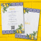 Um moderno monograma de azulejos mediterrâneos e limões, design de casamento, com um fundo branco de lavagem ao estilo mediterrânico. Um design de casamento temático mediterrânico que usa ilustrações aquáticas de azulejos e limões azuis, brancos e amarelos para criar um elegante design de casamento de verão. Um destino charmoso de design de Verão espanhol, grego, italiano ou português, utilizando a tipografia de escrita clássica. Um casamento elegante, azul, branco e amarelo mediterrânico costeiro ou paisagístico, salvo a data QR Code design com elementos modernos. Os convites de casamento e outros artigos de papelaria também estão disponíveis.