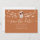 Anuncie o início da sua celebração moderna com o nosso elegante salvando o convite de data. Um encanto rústico radiante em tons laranja vibrantes, adornada com um monograma personalizado, flores impermeáveis de cor-d-água queimadas em frascos-pedras e luzes de cordas brilhantes. Terminado com o roteiro de caligrafia, é a introdução perfeita ao seu dia encantador.