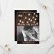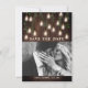 casamento guarde a data com as luzes de Edison Vintage decoradas com verde botânico em cima sobre um fundo de prancha rustica com foto e texto personalizados.