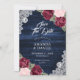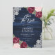 Casamento russo azul-marinho, burgundy e blush salve o cartão de data que contém o hálito do bebê e a burgundy e rosas de pincel com verde em um fundo de madeira de celeiro decorado com rendas florais brancas. Personalize facilmente este modelo de cartão com os seus detalhes de casamento para criar um casamento floral rústico único, salve o cartão de data para o seu marinho azul, burgundy e festa de casamento esfarrapada.