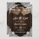 Complemente seu país rústico ou sua festa de casamento de celeiro com este romântico e fácil de personalizar casamento, exceto a data que inclui dois corações de burlap em um fundo de madeira decorado com luzes de cordas e delicados rendas florais brancas.