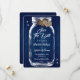 Casamento azul-marinho russo salve o cartão de data apresentando um jarro de pedras e corações de burlap contra um fundo de madeira de celeiro enfeitado com luzes cintilantes. Personalize facilmente este belo casamento azul-marinho rústico, salve a data online. Itens correspondentes disponíveis para complementar este casamento azul marinho salvar a data.