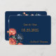 Uma ilustração aquosa de um buquê de pénia brilhante em azul marinho e laranja. O buquê consiste de peônias com flores grandes e redondas e folhas verdes profundas. O fundo é marinho azul. Convites e material de casamento correspondentes estão disponíveis neste conjunto de coleções