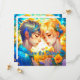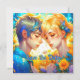 Casamento personalizado Salve as Datas com um tema de anime. Rapaz de anime e garota se abraçando cercado por flores amarelas. Muitos detalhes azuis.