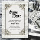 Um elegante ornamentado rústico sangrava madeira esculpida, emoldurada carta de salvamento com vintage usando o texto inglês antigo para mostrar os nomes da noiva e do noivo.