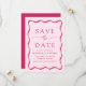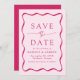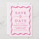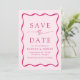 Anuncie seu próximo casamento em estilo com nosso casamento do Modern Wavy Frame, salve as datas! O design apresenta seus nomes e detalhes de casamento enquadrados por um quadro de onda cor-de-rosa escuro contrastando com um fundo de rosa claro. Esta mistura requintada de design moderna e retrô garante que você salve a data não é apenas um lembrete de sua próxima celebração, mas um manto apreciado que captura a essência de sua história de amor.