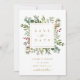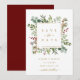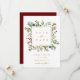 Este cartão plano de salvar a data do casamento apresenta eucalipto aquarelado pintado, folhas verdes, bagas vermelhas, galhos de pinheiro e uma moldura quadrada dourada falsa com um fundo vermelho no verso. Para personalização mais avançada deste design, clique no link "Personalizar ainda mais". Itens correspondentes também estão disponíveis.
