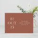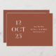 Anuncie a data do seu casamento com um estilo sazonal caloroso usando este cartão minimalista de Save the Date com um rico fundo terracota profundo (também conhecido como argila enferrujada). O layout de data editorial em negrito adiciona um toque moderno e de design avançado, enquanto o verso apresenta espaço para uma foto favorita para um toque pessoal. O tom terroso e quente torna este design perfeito para casamentos de outono e outono, celebrações boho, eventos em vinhedos ou reuniões ao ar livre com texturas naturais e paletas de cores aconchegantes. Personalize a data, nomes, local e foto para combinar com o seu estilo. Disponível como cartão impresso e download digital.