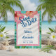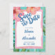 Casamento com tema da ilha tropical Salvar a Data apresenta flores rosa-d'água e hibiscos de coral, verde botânico, palmeiras, guiamento de marinho e borda de bruxaria rústica em um fundo de turquesa vibrante. Perfeito para praia, destino e temas insulares. Trabalho de arte por KL Stock.