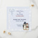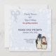 Adorável noiva e noivo pinguim românticos com trajes de casamento em um fundo damasco azul claro. Esses cartões de Salve a Data estão prontos para você personalizar com as informações do seu casamento.