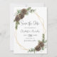 Este elegante casamento com tema de inverno salve o cartão de data com o moderno roteiro de caligrafia, e um quadro geométrico dourado decorado com verde-aquarela, cones de pínus e galhos verdes de inverno, acentuados com groselhas de neve. No verso está uma textura verde de aquarela. Encontre o pacote de convites de casamento correspondente e mais produtos correspondentes na coleção, ou envie-me mensagem através do Zazzle Chat se precisar de ajustes de design ou mais produtos correspondentes.