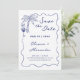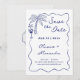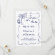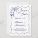 Anuncie as boas notícias do seu casamento próximo com este charmoso e casual convite de casamento com tema costeiro que apresenta desenhos à mão e um brasão de casal personalizado no verso. As ilustrações incluem uma palmeira tropical, concha de estrela-do-mar e coquetel dentro de uma borda ondulada caprichosa. A arte em azul naval náutico em um fundo esbranquiçado é perfeita para cerimônias informais à beira-mar.