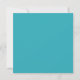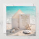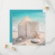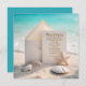 Um cartão de vazio e um envelope descansam em uma praia arenosa cercada por conchas, estrelas-do-mar, e um fundo oceânico turquesa para um convite de casamento. Todo o texto pode ser alterado. A cor de fundo no lado inverso pode ser alterada.