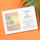 Sunset Beach Wedding Salve o cartão de anúncio da data com um design de tipografia e palmeiras tropicais. Com uma inscrição personalizável, você pode adicionar seus nomes e informações de casamento. Você também pode adicionar sua própria foto para adicionar um toque de personalização. Excelente para planejar os núpcias de destino.