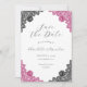 Complemente sua festa de casamento rosa quente e preto com estes belos cartões de save the date com renda floral elegante.