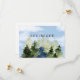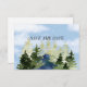 Um belo casamento Salve o cartão de data está em um fundo de verdes e azuis com árvores em primeiro plano. Esta opção Salvar a data faz parte de um conjunto de produtos que correspondem ao design. Este é um convite casual adequado a um serviço e recepção de resorts de lago