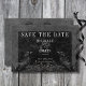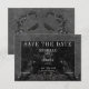 Traga seus convidados para um mundo de elegância escura e encantadora com nosso casamento gótico vintage salve o cartão de data. O fundo preto profundo, envelhecido, define a palco para um contraste impressionante, à medida que o texto branco em negrito emerge de intrincadas caixas de texto em preto. No ápice deste convite, uma fronteira gótica tridimensional adornada com uma raia negra real captura a essência do mistério e do romance. O dorso é enfeitado com duas videiras interligadas de rosas pretas formando sutilmente um coração em torno de dois abraços, o que adiciona um toque de fascínio dramático. Liberte a magia e dê o tom para um dia de casamento inesquecível. Este cartão faz parte da Suíte de Casamento de Rosas Negras Gótica Raven & Black criada pela Simplesmente Farmhouse Press.