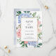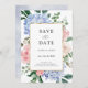 Moderno salve o cartão de data com hidrangas azuis claras/poeirentas de cor azul-d'água com cor pastel rosa, pincel, rosas brancas, peonias, folhas de eucalipto de sábado, galhos e folhagem. Tons românticos, suaves e sonhentos, primavera, designs florais de cor d'água de verão para combinar com o seu casamento temático. Por favor, encontre mais designs e variações na minha loja de "blisswedingpaperie". E fique à vontade para me contactar para mais personalizações ou itens correspondentes.