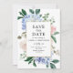 Moderno salve o cartão de data com hidrangas azuis claras/poeirentas de cor azul-d'água com cor pastel rosa, pincel, rosas brancas, peonias, folhas de eucalipto de sábado, galhos e folhagem. Tons românticos, suaves e sonhentos, primavera, designs florais de cor d'água de verão para combinar com o seu casamento temático. Por favor, encontre mais designs e variações na minha loja de "blisswedingpaperie". E fique à vontade para me contactar para mais personalizações ou itens correspondentes.