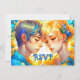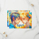 Cartões RSVP personalizados com um tema de anime. Rapaz de anime e garota se abraçando cercado por flores amarelas. Muitos detalhes azuis.