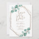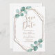 Este casamento botânico salve a data da placa lisa mostra um design moderno com as palavras "Salvar a Data" em um roteiro de cobre falso, com letras manuais, com os detalhes do seu casamento no centro para você personalizar bordado por um falso quadro de cobre geométrico acentuado pela pintura manual de cor d'água eucalipto verde. Os melhores votos para o seu casamento! Desenhada por Susan Coffey.