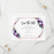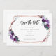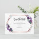 Flores roxas elegantes rosa ouro armação geométrica casamento floral salve o cartão de data que você pode personalizar facilmente com seus detalhes clicando no botão "Personalizar". Apresenta a tipografia popular moderna com texto de script a preto sobre fundo branco. DICA: produtos correspondentes disponíveis abaixo para sua conveniência