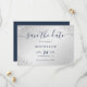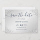 Um casamento elegante de azul e cintilação prateada do marinho salve o cartão de data com uma letra moderna e cantos cintilantes prateados em um fundo de gradiente prateado. Itens correspondentes disponíveis.