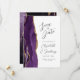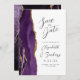 A borda esquerda deste elegante cartão de aviso de casamento moderno apresenta uma borda de ágata em azul roxo com pintura à água, aparada com brilho falso dourado. O texto personalizável combina fontes douradas manuscritas, copperplate e itálicas em um fundo de ameixa. O verso apresenta um design de ágata roxa e dourada correspondente.