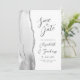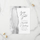 A borda esquerda deste elegante casamento moderno salve o cartão de data com uma cinza e uma aquarela branca, aparada com falso brilho prateado. O texto personalizável combina a escrita manual de cinzas de carvão, as fontes em copperplate e itálico em um fundo branco. O verso apresenta uma cinza correspondente, design branco e agata prateada.