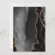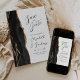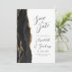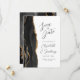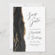 A borda esquerda deste elegante casamento moderno salve o cartão de data apresenta uma borda preta de água, cortada com brilho dourado. O texto personalizável combina a escrita manual de cinzas de carvão, as fontes em copperplate e itálico em um fundo branco. O verso apresenta um design de agate preto e dourado correspondente.