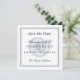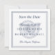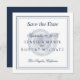Texto azul marinho com borda clássica sobre a concha. Faça uma declaração em negrito com esta data que não seja para salvar fotos. Elegante e simples "salvar a data" em um convite em formato quadrado. Detalhes sobre o seu casamento na frente com o endereço do site na parte de trás. Personalize mais com todos os detalhes que você quiser.