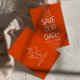 Este casamento minimalista ocidental moderno e retrógrado Salve a Modelo de Data é excelente para você. Se você está procurando por um bonito, elegante e fácil personalização do casamento Salve o Modelo de Data. Um casamento muito elegante, simples e chic, com a escritura terrestre, salve a data e as calças de cacto. O que mostra branco salve nossa data ousada tipografia escrita à mão sobre fundo laranja comum queimado no oeste. Com nomes de noivas e noivas personalizáveis nas costas com plantas de cacto desenhadas à mão. Pegue esse casamento da na moda oeste, salve a data e faça seus convites realmente comprometidos.