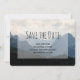 Casamento salve o cartão de data com uma fotografia de belas montanhas, céu nublado e colinas rolantes cheias de árvores em primeiro plano. esquema de cor azul da cinza.