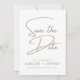 Um design elegante minimalista é apresentado neste documento Salvar a placa de data. O cartão branco tem a opção Save The Date (Salvar a data) em uma tipografia de escrita manual em ouro. Personalize com seus nomes, data do casamento e localização em uma simples fonte dourada.