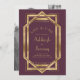 Este elegante casamento inspirado na vintage Salve o cartão de data com texto dourado num fundo vermelho burgundy, enquadrado por um design de arte de vintage geométrica. Substitua a imagem de exemplo no verso por sua foto vertical favorita.