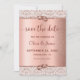 Anuncie seu próximo casamento em estilo glam com este elegante ouro de rosa, salve o cartão de data. A placa apresenta a tipografia do script de tendência, e a parte superior e inferior são agrupadas com o damasco de ouro rosa.