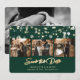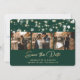 Elegante e esmeralda, foto de casamento dourada e verde salva o cartão de data. Nosso casamento salvou a data mostra uma coleção de fotos de 3 imagens contra um fundo verde esmeralda enfeitado com luzes de cordas na frente e uma foto na parte de trás. Personalize facilmente este esmeraldo verde salve o cartão de data com suas fotos e detalhes do casamento.
