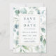 Este casamento salva a data do convite... retrata a cor d'água do eucalipto e as folhas verdes botânicas com uma estrutura retangular de ouro.