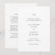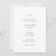 Convite de casamento elegante com design simples, incluindo seu monograma e detalhes do evento em fontes serifadas.