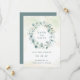 Elegante, guarde o cartão de data com uma coroa composta por folhas de eucalipto e verde com uma dica de azul. Abaixo estão os detalhes do seu casamento em verde escuro sobre uma lavagem a aquarela pastel com manchas de brilho sujo. A parte de trás é uma sombra correspondente de verde azul macio. Esta simples e rústica design é excelente para um casamento de temas botânicos no verão.