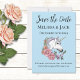 Um design de casamento temático de fantasia romântica apresentando um gracioso unicórnio branco cercado por flores pastéis suaves e folhagens exuberantes. Esta ilustração encantadora captura uma estética de conto de fadas sonhador, perfeita para casais que amam temas mágicos, flores caprichosas ou arte de fantasia elegante.