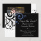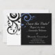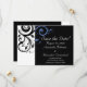 Convites de casamento preto modernos contemporâneos ousados e impressionantes com detalhes em branco e azul centáurea perívínca, com delicado fundo de folha de rolagem em redemoinho. Personalize online com os detalhes do seu casamento.
