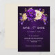 Cartão de aviso de casamento com tema dourado roxo real elegante, apresentando um buquê elegante de flores de rosa roxa real, índigo, dourado, amarelo e folhas de eucalipto. Por favor, entre em contato comigo para qualquer ajuda na personalização ou se precisar de qualquer outro produto com este design.