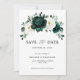 Elegante verde-esmeralda e botânico floral branco de marfim salve o cartão de data com rosas brancas e elegantes folhas de cor aquosa de eucalipto. Entre em contato comigo para obter ajuda sobre a personalização ou se você precisar de outro produto com este design.