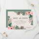 Design moderno de convite de casamento com flores de aquarela em rosa poeirado e folhas tropicais em um fundo creme. O verso do cartão é de uma linda cor verde sage.