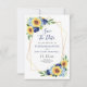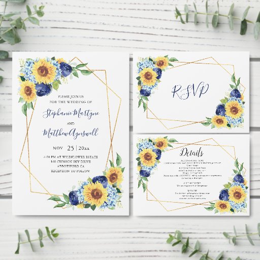Estes cartões salve a data apresentam um design floral de aquarela com girassóis, híbridos azuis empoeirados e rosas marinhos com estrutura geométrica falsa de ouro. Personalize estas cartas com o seu próprio texto. Produtos correspondentes disponíveis.