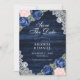 Casamento elegante, azul e azul-marinho, salve o cartão de data que contém o hálito do bebê e rosas azuis e azuis com verde em um fundo de madeira de celeiro decorado com rendas florais brancas. Personalize facilmente este modelo de cartão com os detalhes do seu casamento para criar um casamento floral rústico único, salve o cartão de data para o seu marinho azul e a festa de casamento escamoteada.