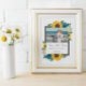 Design apresenta girassóis, rosas e margaridas elegantes com uma paleta de cores amarela, lacrimejante e branca ouro. Design também apresenta uma estrutura de cinza de carvão. Você pode alterar a cor de fundo na parte frontal e na parte traseira para a cor de sua escolha ou deixar ambas definidas como brancas. Modelo de foto via Pixabay licenciado sob CC0 e deve ser substituído por sua própria foto