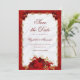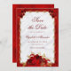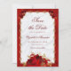 Este casamento floral de luxo salve o cartão de data com um roteiro elegante, rosas vermelhas decorando um quadro de filigrana dourado, e uma cebola branca e fundo metálico vermelho falso. Verifique a coleção de produtos correspondentes ou entre em contato comigo através do Zazzle Chat para obter o item especial que você está procurando.