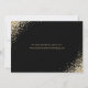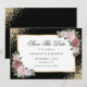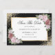Casamento floral preto e ouro elegante salve o cartão de data com flores cor-de-rosa e verde definindo os detalhes do casamento dentro um quadro de ouro contra um fundo preto adornado com confete de ouro. Casamento floral de preto e ouro salve o cartão de data.